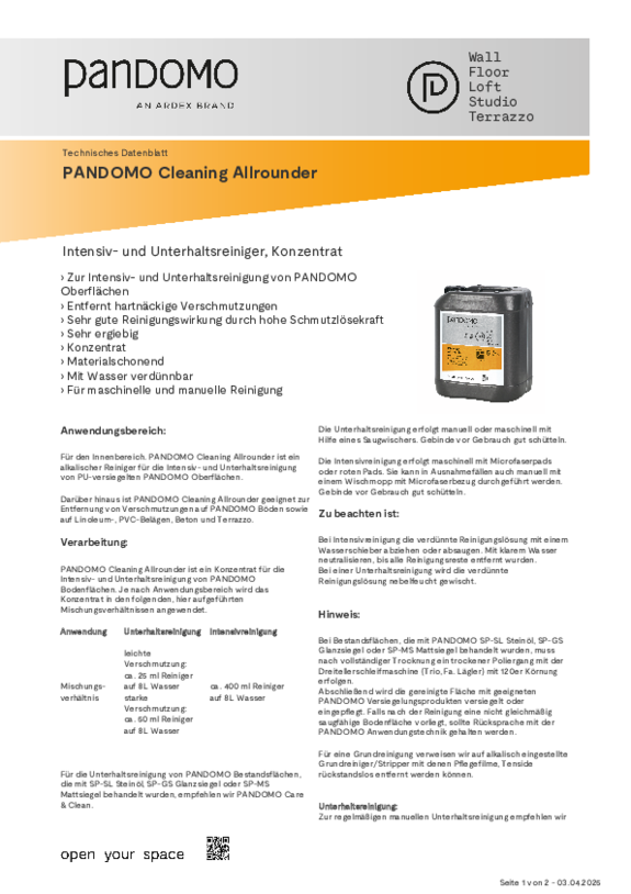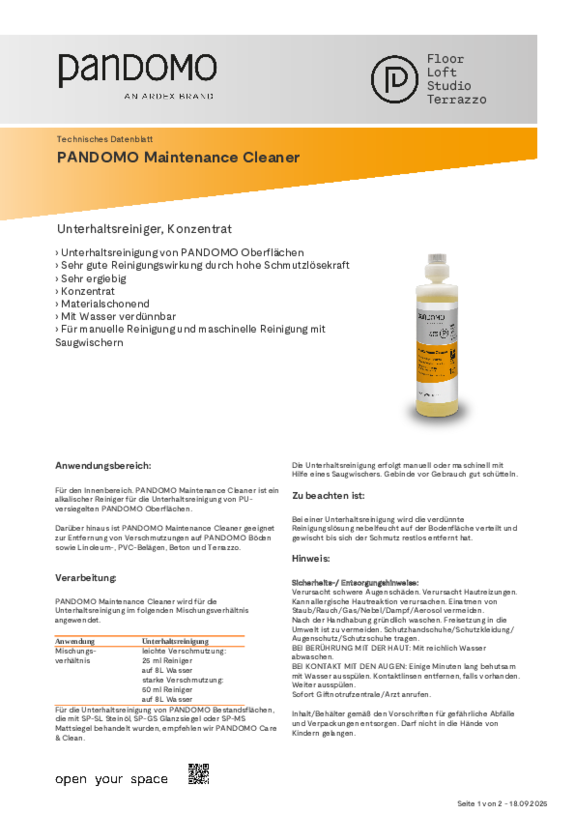 PANDOMO Oberflächen sind sehr widerstandsfähig und leicht zu reinigen. Eine Reinigung mit Neutralreinigern ist jederzeit möglich. Stehende Flüssigkeiten sollten sofort aufgenommen werden. PANDOMO bietet auch eigene Reinigungsprodukte an. Für detaillierte Informationen laden Sie unsere Reinigungsbroschüre herunter.